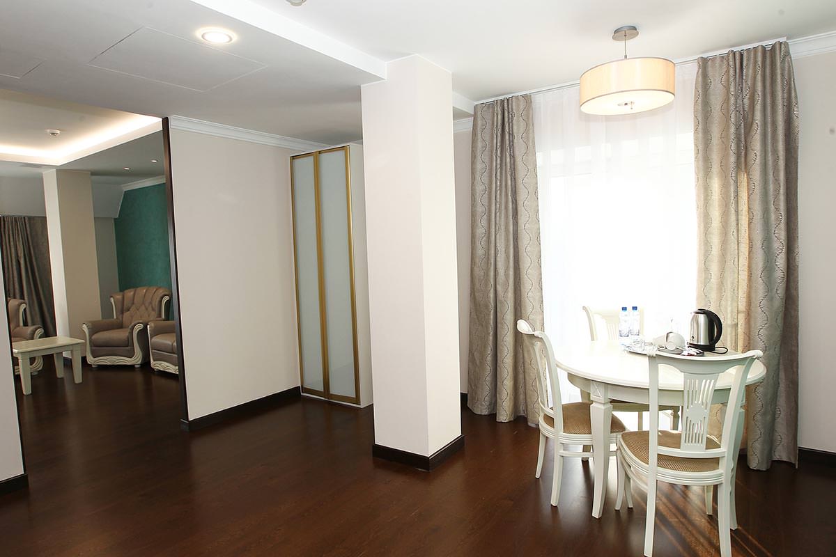 В номере имеются три основных спальных места: два на двуспальной кровати и одно на раскладном диване. Кроме того, номер укомплектован двухместным раскладным диваном, который позволяет разместить ещё два человека на дополнительных спальных местах. Из дополнительных удобств в номере есть большой круглый стол, который можно использовать для занятий, игр, а также семейных чаепитий.