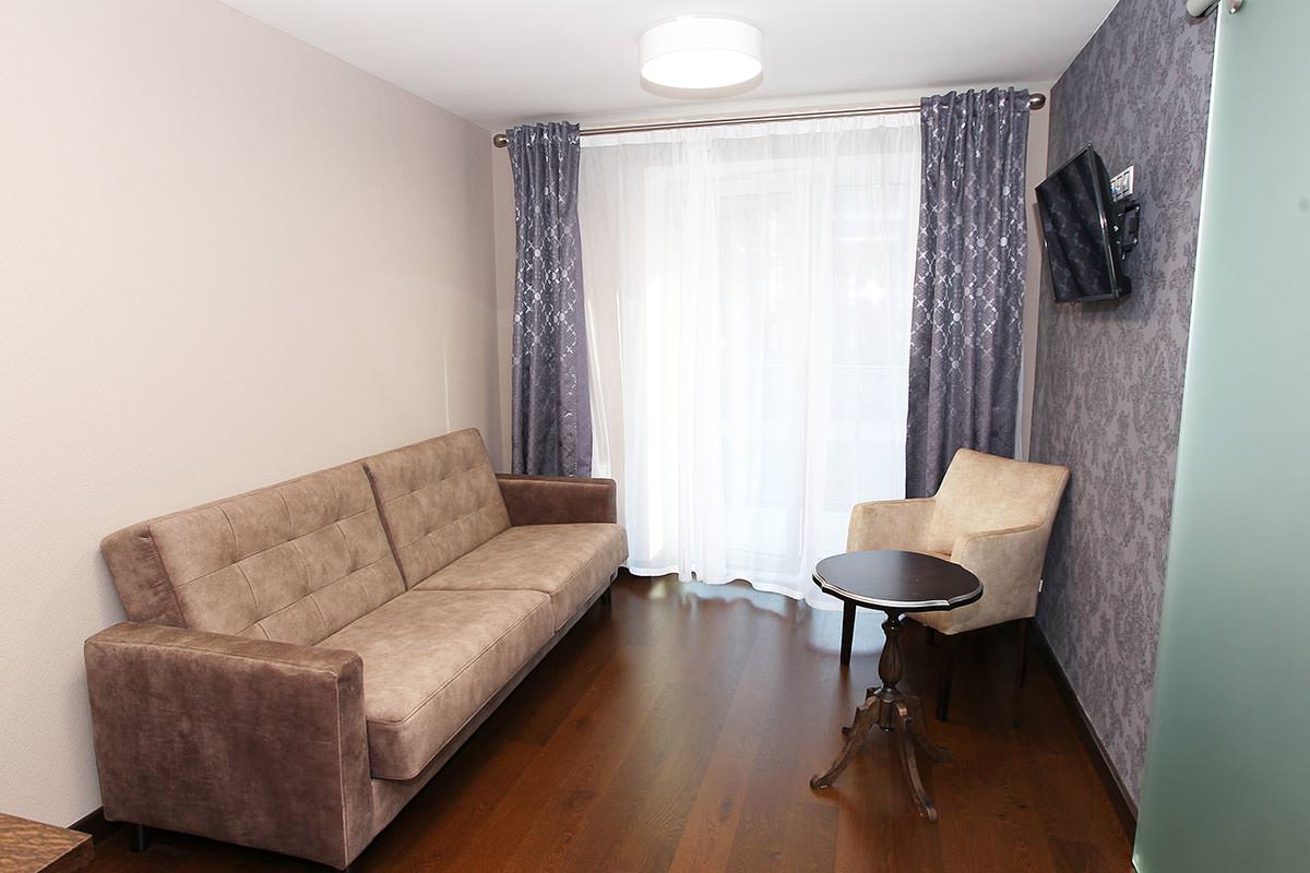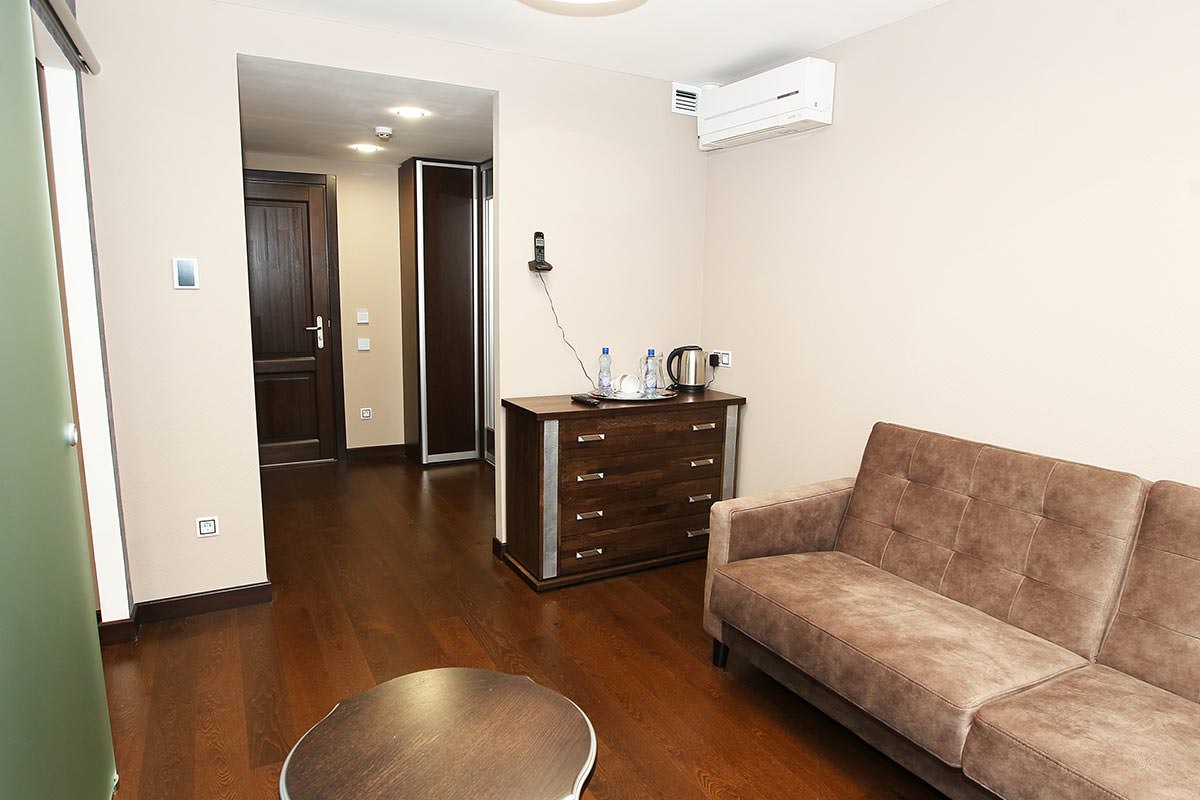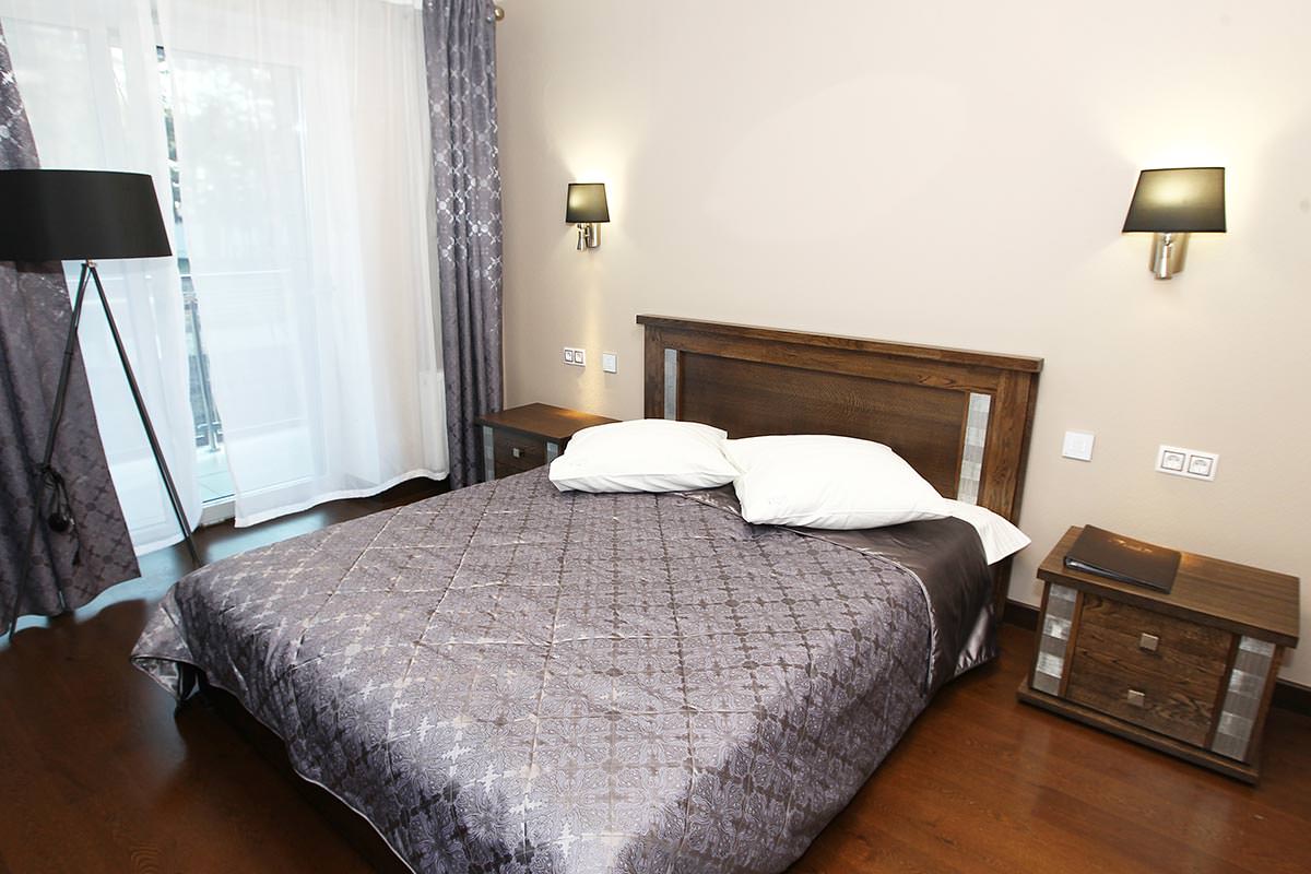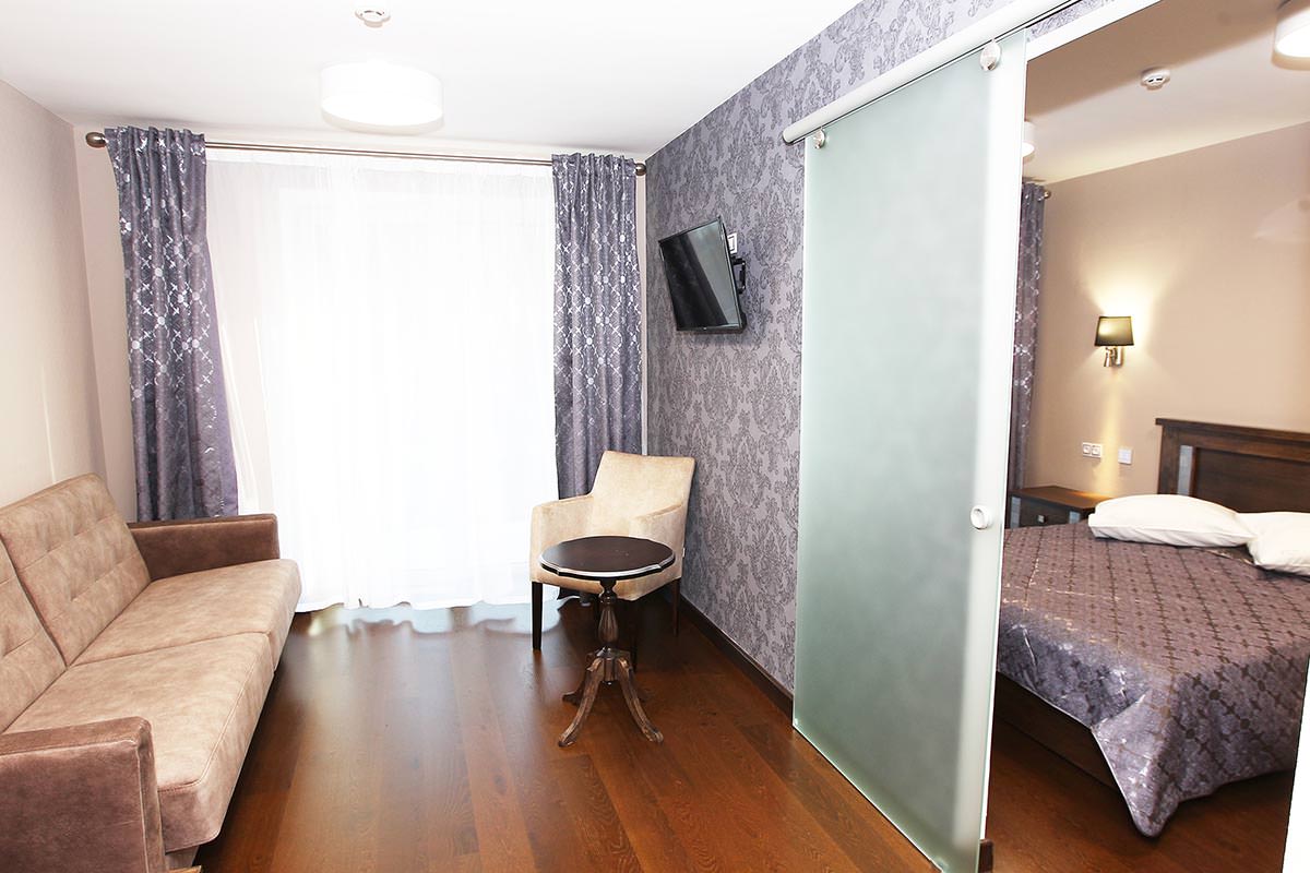 Номер состоит из двух комнат. В спальне расположена двуспальная кровать, а в гостиной – двухместный раскладной диван, который позволяет разместить ещё два человека на дополнительных спальных местах.