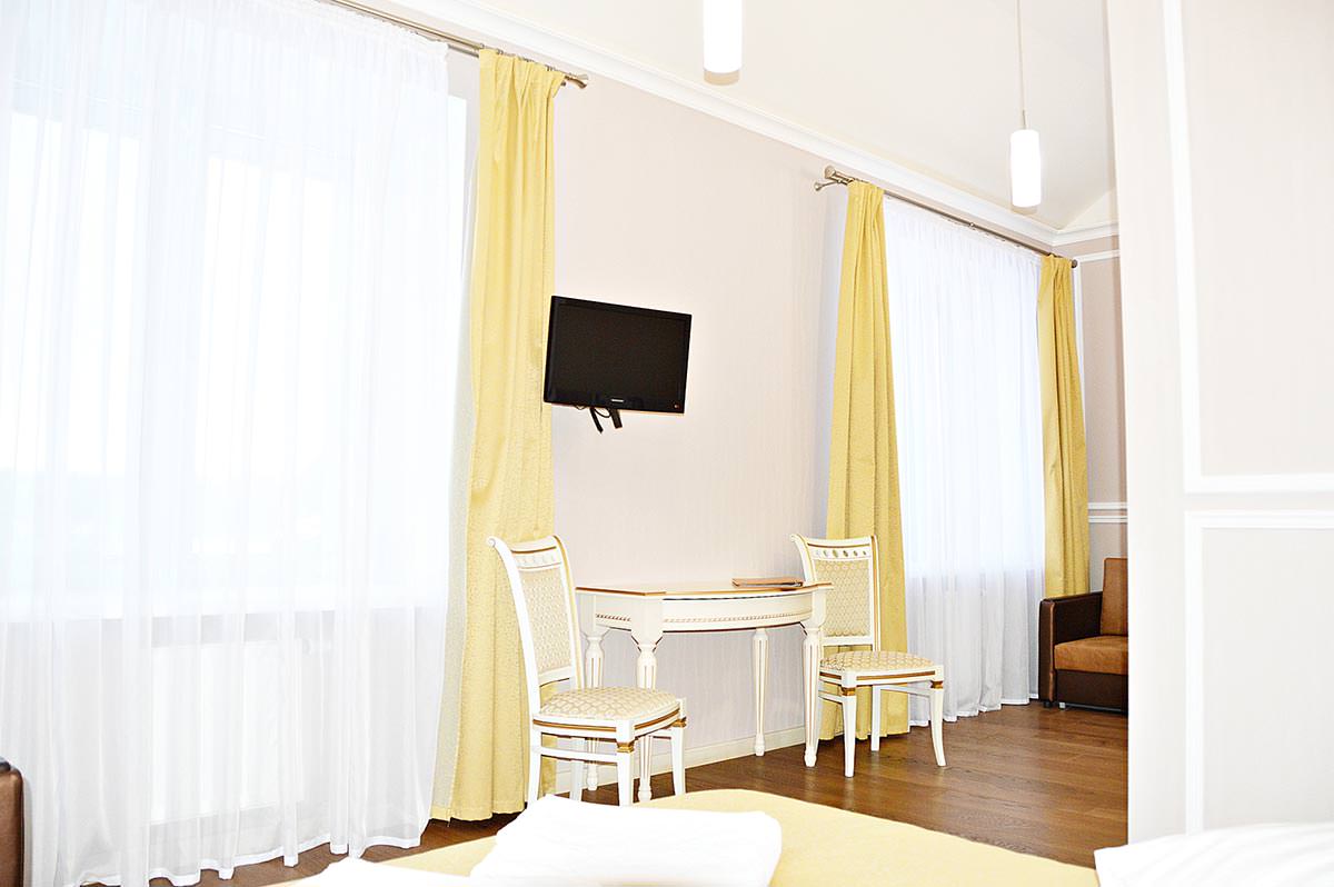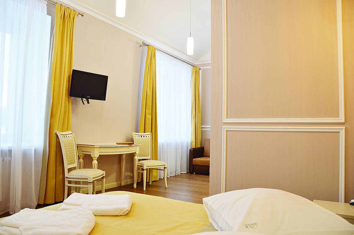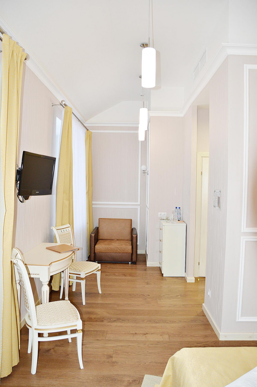 В номере: Удобная мебель; Система кондиционирования и вентиляции воздуха с возможностью индивидуального регулирования температуры; Wi-Fi; Телефонная связь; Телевизор с плоским экраном; Мини холодильник; Сейф.